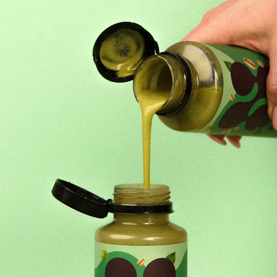 Ekološki tekoči obrok | Sestavine: voda, zgoščeni jabolčni sok*, grahove beljakovine* (5.6 %), brezglutenska polnozrnata ovsena kaša* (5.4 %), sveža špinača* (4.7 %), zgoščeni limonin sok*, inulin iz korena cikorije*, datljev sirup*, mandljeva pasta*, ingver v prahu*, indijski trpotec v prahu*, morska sol*, gostilo: gumi iz zrn rožičevca v prahu*, vanilija v prahu*, izvleček poprove mete*.